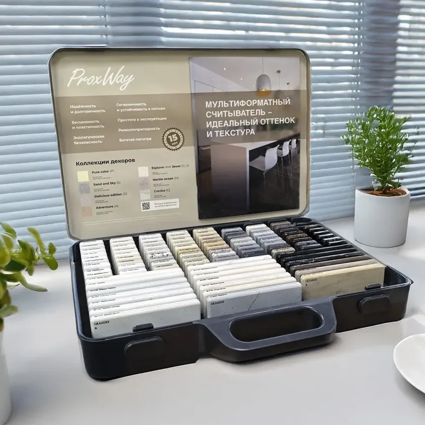 Чтобы гарантировать точное соответствие цвета, наш специалист привезёт вам физические образцы материалов, что позволит подобрать идеальный оттенок непосредственно на месте.